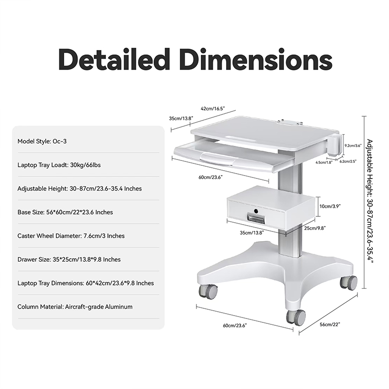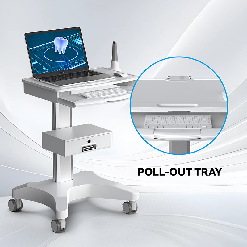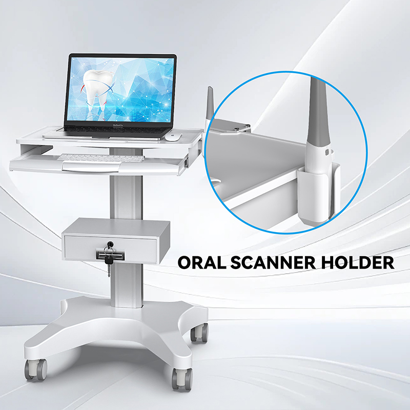 Ce chariot médical polyvalent révolutionne les cliniques dentaires et les instituts de beauté en milieu hospitalier. Il est conçu pour optimiser l'efficacité des flux de travail. Il est équipé d'un plateau dédié pour ordinateur portable, facilitant la gestion des dossiers numériques et l'utilisation des logiciels, ainsi que d'un support personnalisé pour scanner buccal, qui permet de sécuriser et d'accéder facilement aux équipements de numérisation coûteux, éliminant ainsi l'encombrement et réduisant les risques de dommages aux appareils.