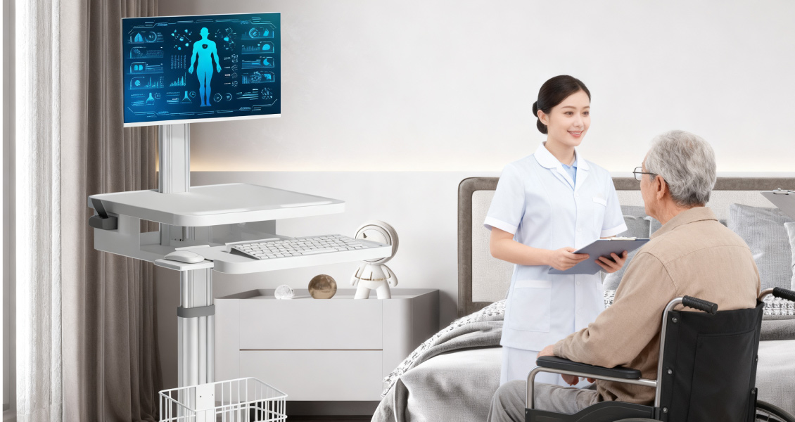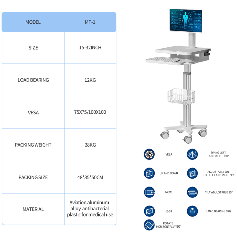 Ce chariot médical est doté d'une colonne réglable en hauteur supportant un écran numérique pour le suivi des données patient en temps réel. Son design épuré comprend un plateau de clavier coulissant et une base mobile robuste avec roulettes verrouillables pour une mobilité clinique optimale.