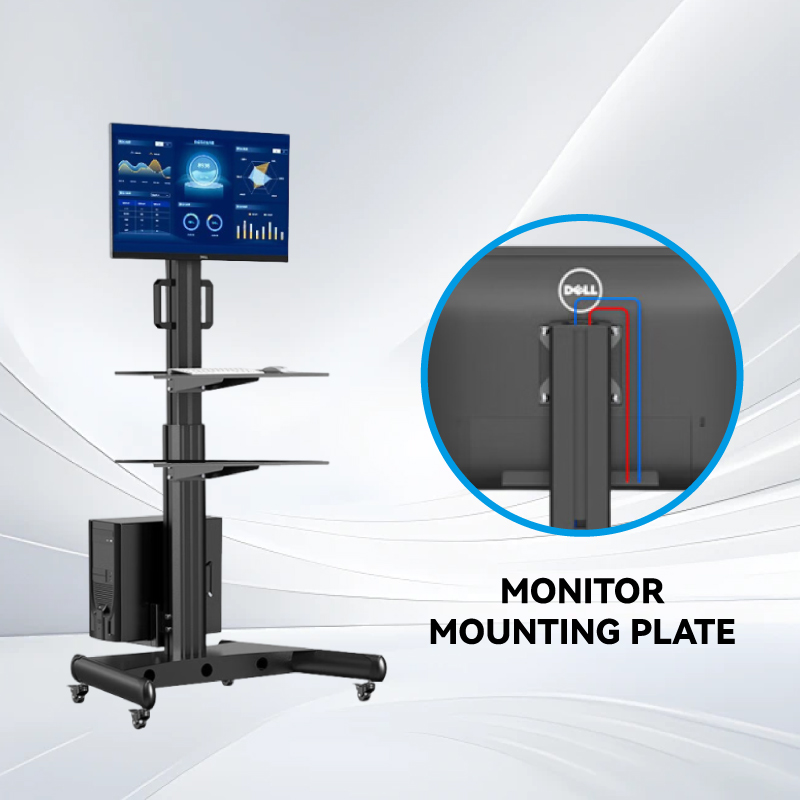 Ce chariot médical est doté d'une colonne réglable en hauteur supportant un écran numérique pour le suivi des données patient en temps réel. Son design épuré comprend un plateau de clavier coulissant et une base mobile robuste avec roulettes verrouillables pour une mobilité clinique optimale.
