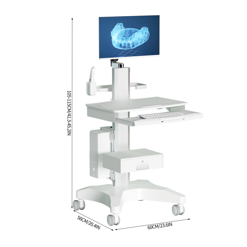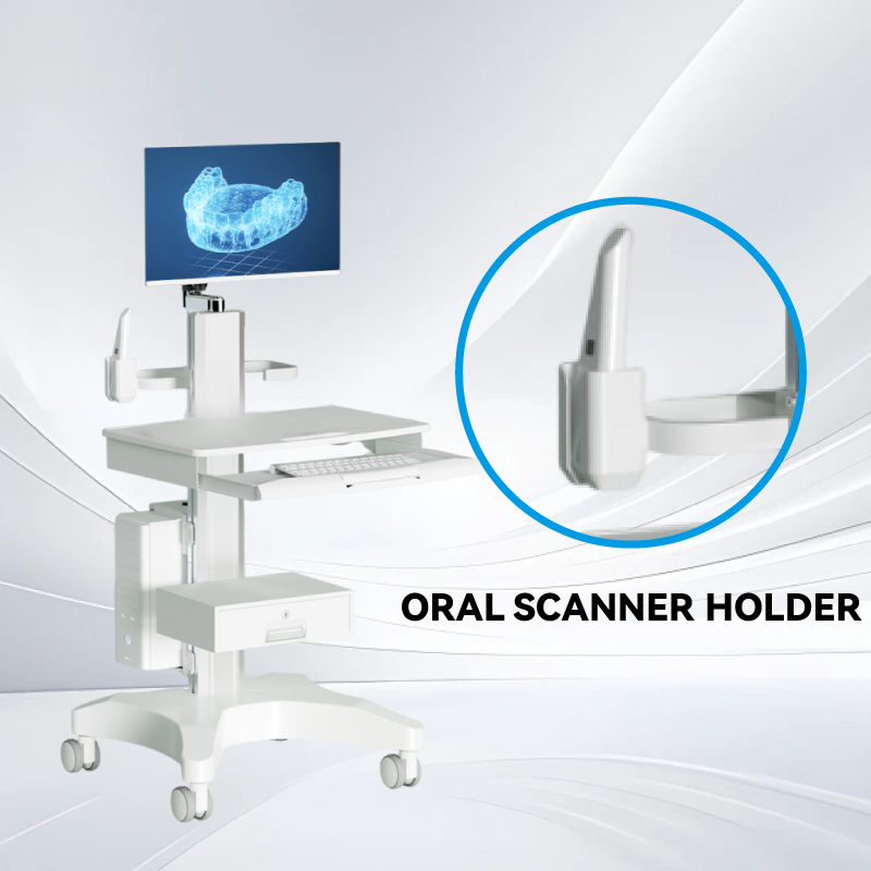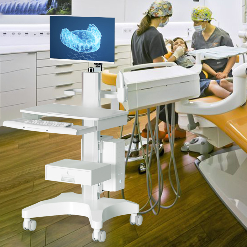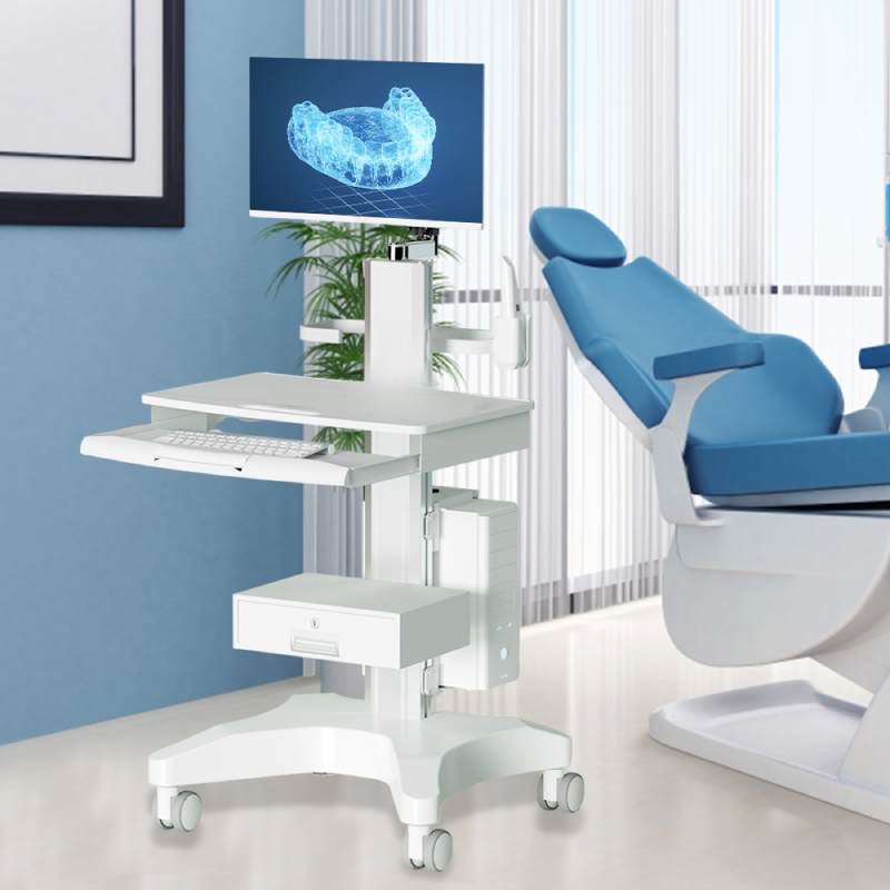 Chariot médical équipé de tiroirs verrouillables, d'une hauteur réglable et d'un bras pneumatique permettant un mouvement libre avec rotation dans toutes les directions, complet avec un support de scanner intra-oral.