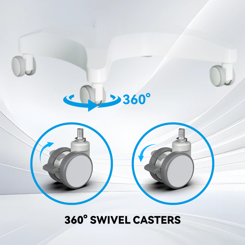 Le chariot pour ordinateur portable Likaymo est équipé de quatre roues pivotantes à 360° de 7,6 cm de diamètre, équipées de freins à pédale pour une mobilité fluide et un positionnement sûr. Les grandes roues franchissent facilement les seuils et les passages de moquette, offrant une maniabilité aisée sur différents types de sols, que ce soit en clinique, à l'hôpital ou en institut. Son châssis robuste assure une bonne stabilité pendant l'utilisation, et ses roues verrouillables garantissent un maintien parfait à l'arrêt.