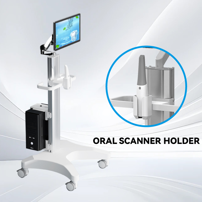 Un chariot médical à hauteur réglable avec un bras pneumatique qui permet un mouvement libre, une rotation dans toutes les directions et est équipé d'un support de scanner intra-oral.