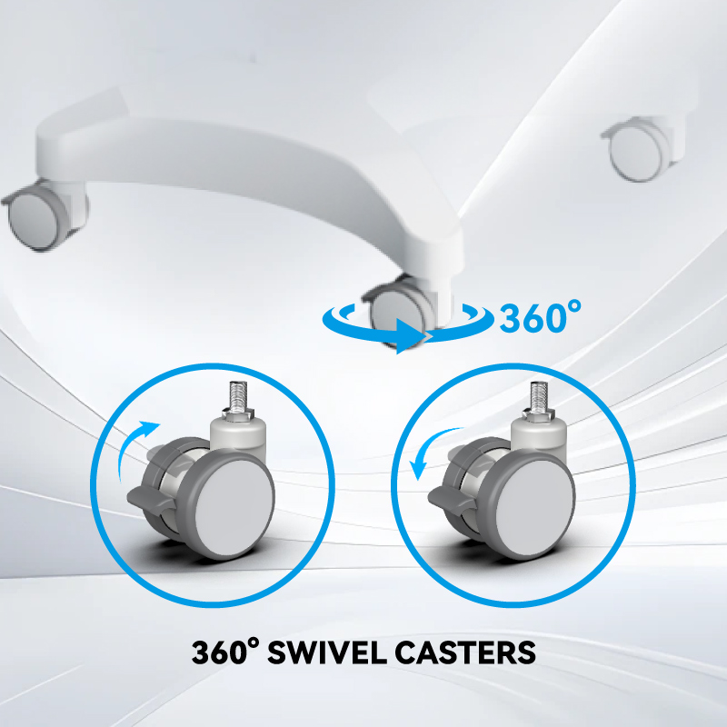 Le chariot pour ordinateur portable Likaymo est équipé de quatre roues pivotantes à 360° de 7,6 cm de diamètre, équipées de freins à pédale pour une mobilité fluide et un positionnement sûr. Les grandes roues franchissent facilement les seuils et les passages de moquette, offrant une maniabilité aisée sur différents types de sols, que ce soit en clinique, à l'hôpital ou en institut. Son châssis robuste assure une bonne stabilité pendant l'utilisation, et ses roues verrouillables garantissent un maintien parfait à l'arrêt.