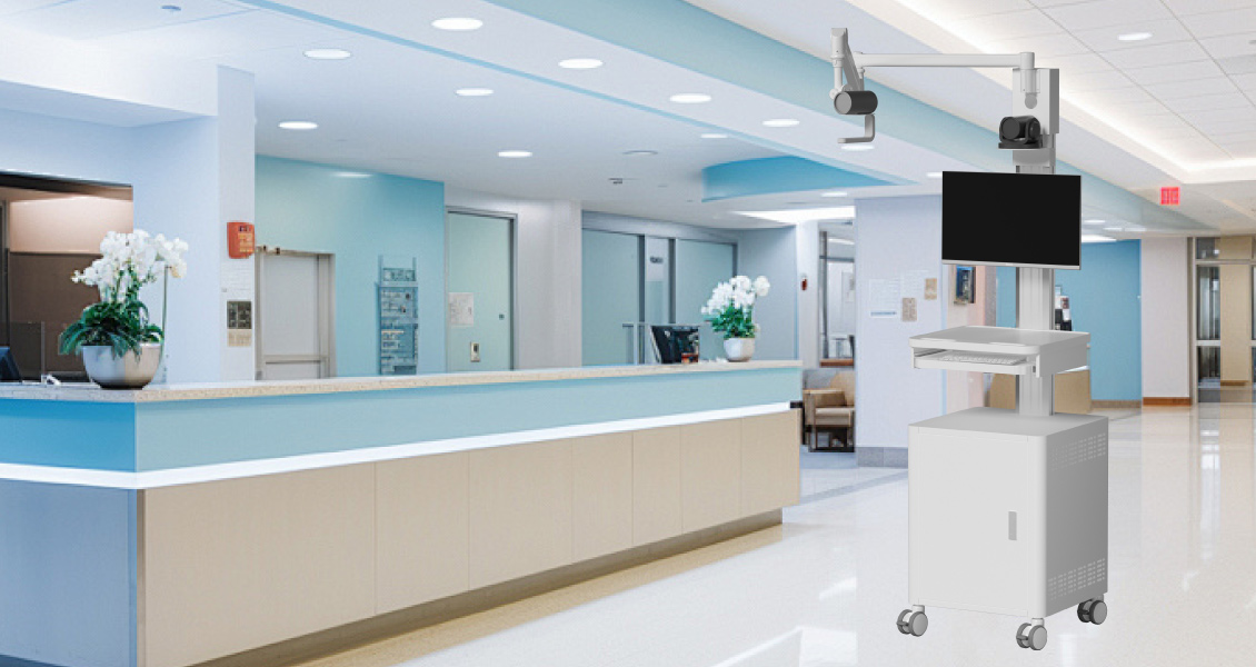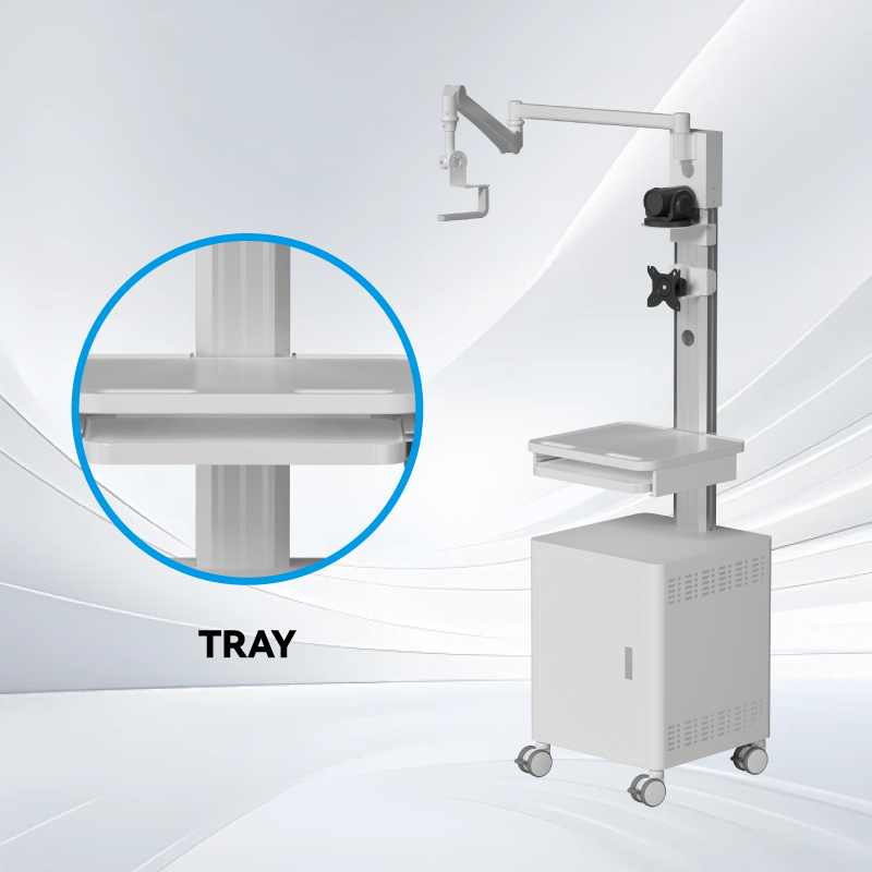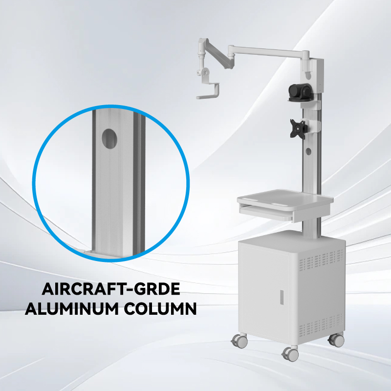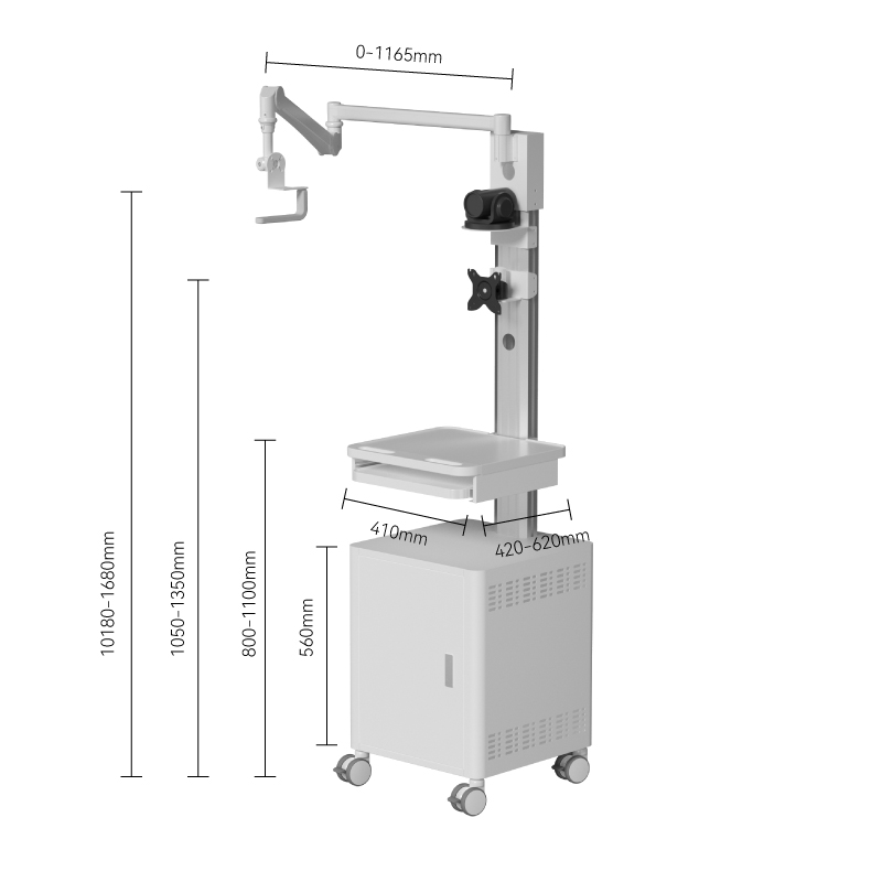 This mobile medical workstation cart is a professional, multi-functional medical trolley designed for modern hospitals, clinics, dental practices and telemedicine centers, integrating a robust aircraft-grade aluminum column, 360° swivel casters with brakes, and a fully adjustable arm system to meet diverse clinical needs. With an impressive 0-1165mm extended arm and a height adjustment range of 1018-1680mm (with optional 1050-1350mm and 800-1100mm height settings), the cart allows precise positioning of monitors, cameras and medical devices, ensuring optimal viewing and operation for medical staff in various scenarios. The 410mm*420-620mm spacious tray provides ample space for keyboards, mice and medical peripherals, while the integrated lockable storage cabinet offers secure storage for medical supplies, cables and sensitive equipment, maintaining a clean, organized and professional clinical workspace. Constructed with high-strength aircraft-grade aluminum, the cart delivers exceptional stability, anti-shake performance and long-term durability, making it suitable for busy medical environments; additionally, the 360° swivel casters with brakes enable smooth, quiet movement between wards, clinics and operating rooms, with a secure locking mechanism to prevent accidental shifting during patient care. Equipped with a standard monitor mounting plate and adjustable camera arm, the trolley is widely compatible with medical monitors, dental intraoral scanners, telemedicine cameras, patient monitors and other clinical devices, boasting an ergonomic design that reduces physical strain during long shifts and a easy-to-clean surface that complies with strict hospital infection control standards. Whether used for patient monitoring, dental scanning, telemedicine consultations or daily clinical workflows, this mobile medical cart combines practicality, durability and medical-grade quality, making it an essential tool for elevating the efficiency and professionalism of any medical facility.
