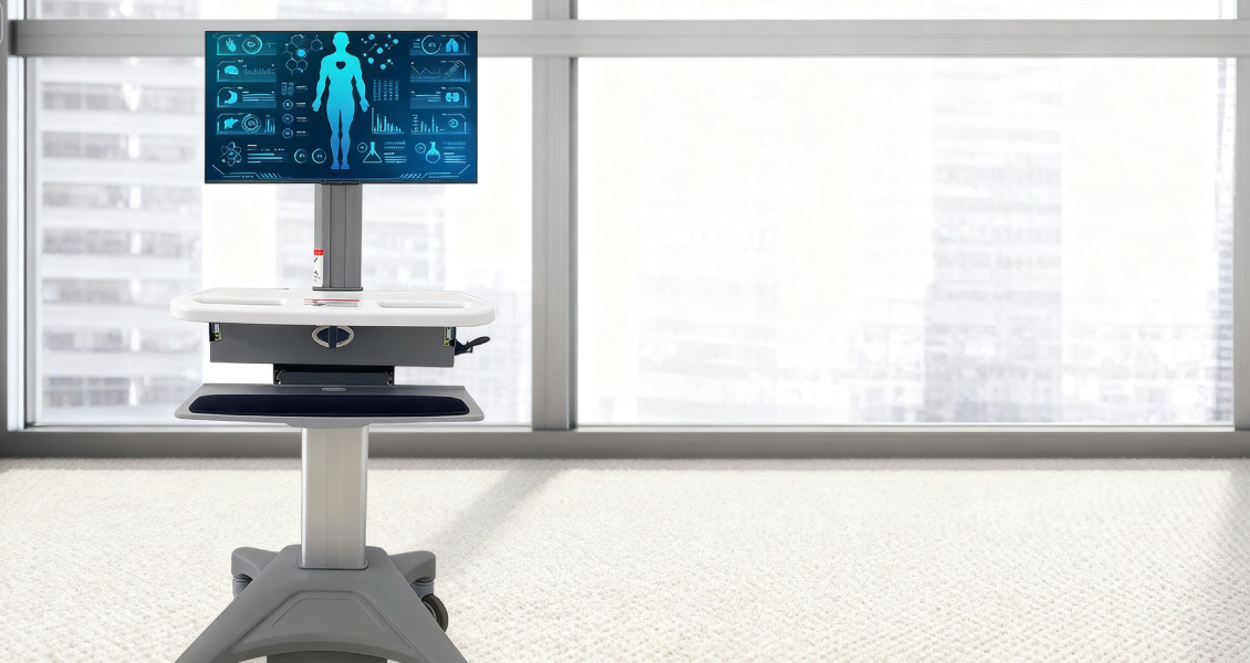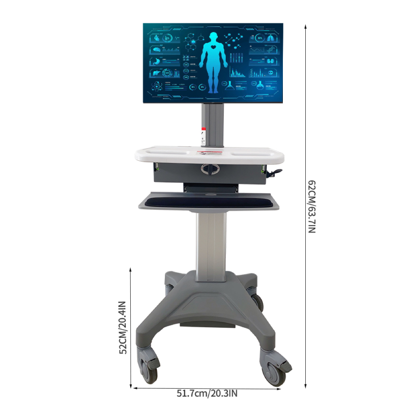 Ce chariot médical électrique est doté d'une conception alimentée par batterie pour une mobilité sans fil, avec un moniteur réglable sur un bras articulé, une surface de travail spacieuse et un rangement intégré pour une utilisation clinique pendant les tournées.