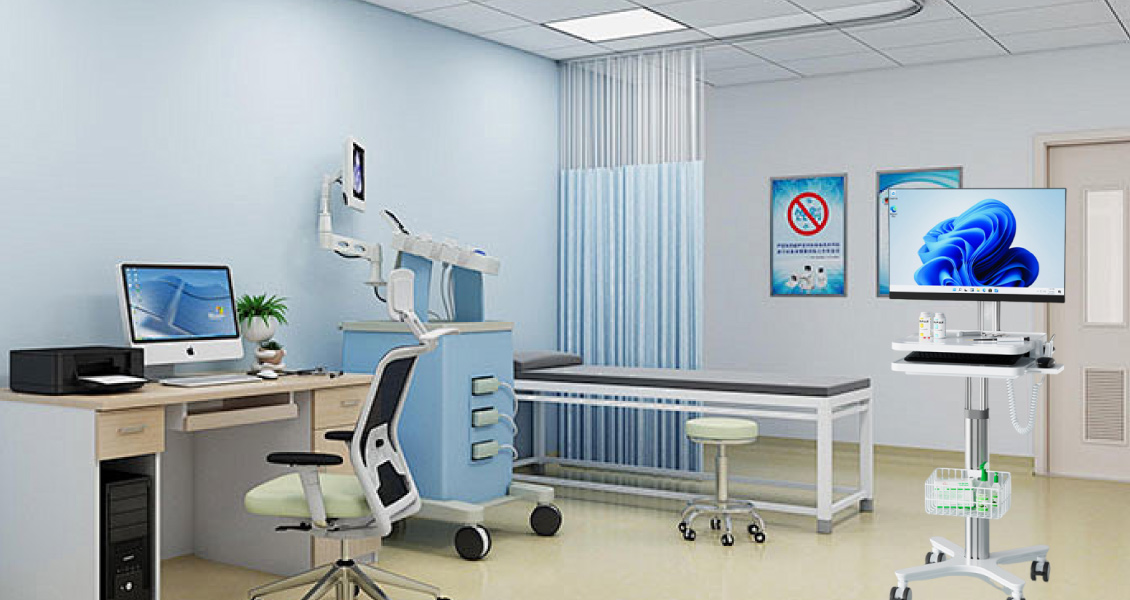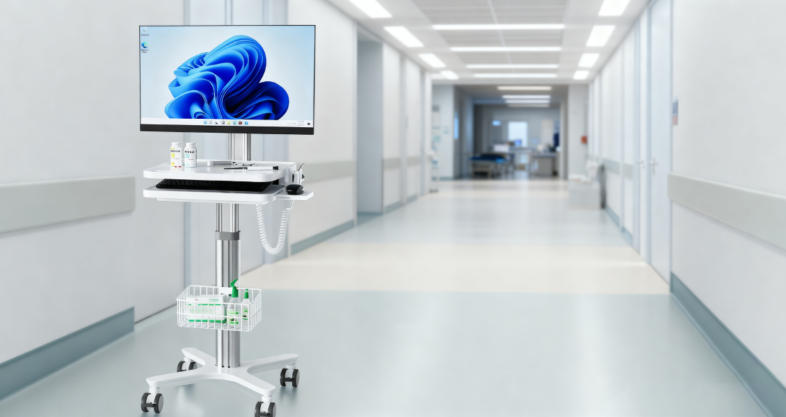 Ce chariot médical est doté d'une colonne réglable en hauteur supportant un écran numérique pour le suivi des données patient en temps réel. Son design épuré comprend un plateau de clavier coulissant et une base mobile robuste avec roulettes verrouillables pour une mobilité clinique optimale.