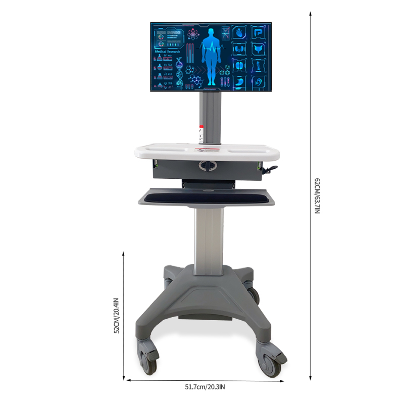 Ce chariot médical est doté d'une colonne réglable en hauteur supportant un écran numérique pour le suivi des données patient en temps réel. Son design épuré comprend un plateau de clavier coulissant et une base mobile robuste avec roulettes verrouillables pour une mobilité clinique optimale.