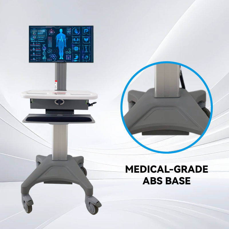 La base en plastique ABS du chariot allie durabilité et fonctionnalité. L'ABS offre une résistance élevée aux chocs, protégeant ainsi des collisions dans les environnements cliniques très fréquentés. Sa rigidité intrinsèque assure la stabilité des équipements sensibles, tandis que sa légèreté améliore la maniabilité. Résistant aux produits chimiques et facile à désinfecter, il répond aux normes d'hygiène les plus strictes. La stabilité dimensionnelle du matériau prévient les déformations, garantissant une fiabilité à long terme avec un entretien minimal.